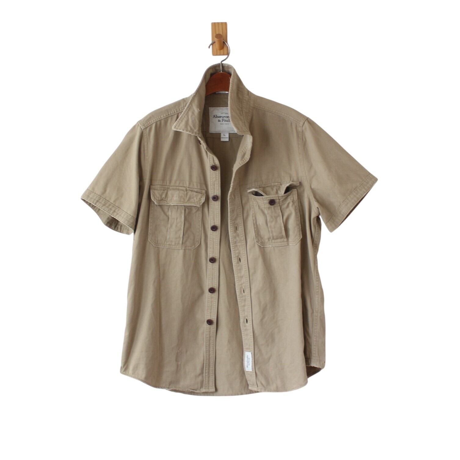 ABERCROMBIE & FITCH アバクロ 半袖 ワークシャツ ユーズド、リペア加工 ベージュ系のカーキ L (w-3520521)