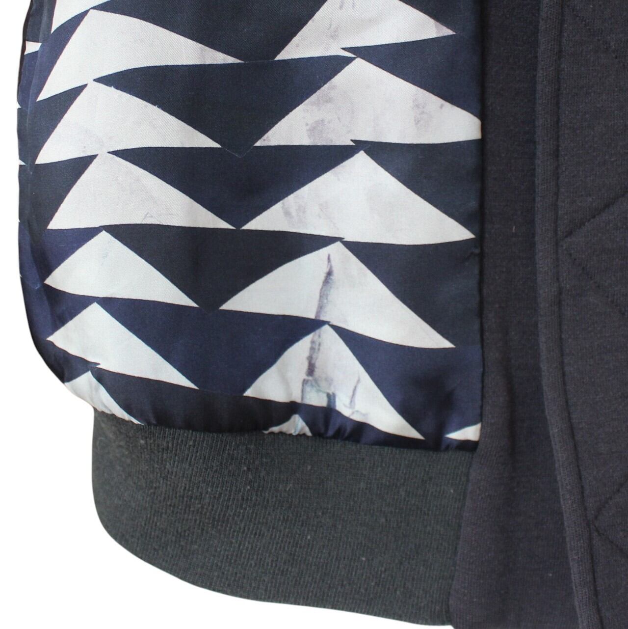 身頃裏地は幾何学模様になっていて、袖裏は無地、さらにポケット裏地はピンドット柄と、ブランドらしい裏地に遊びのあるデザインです。