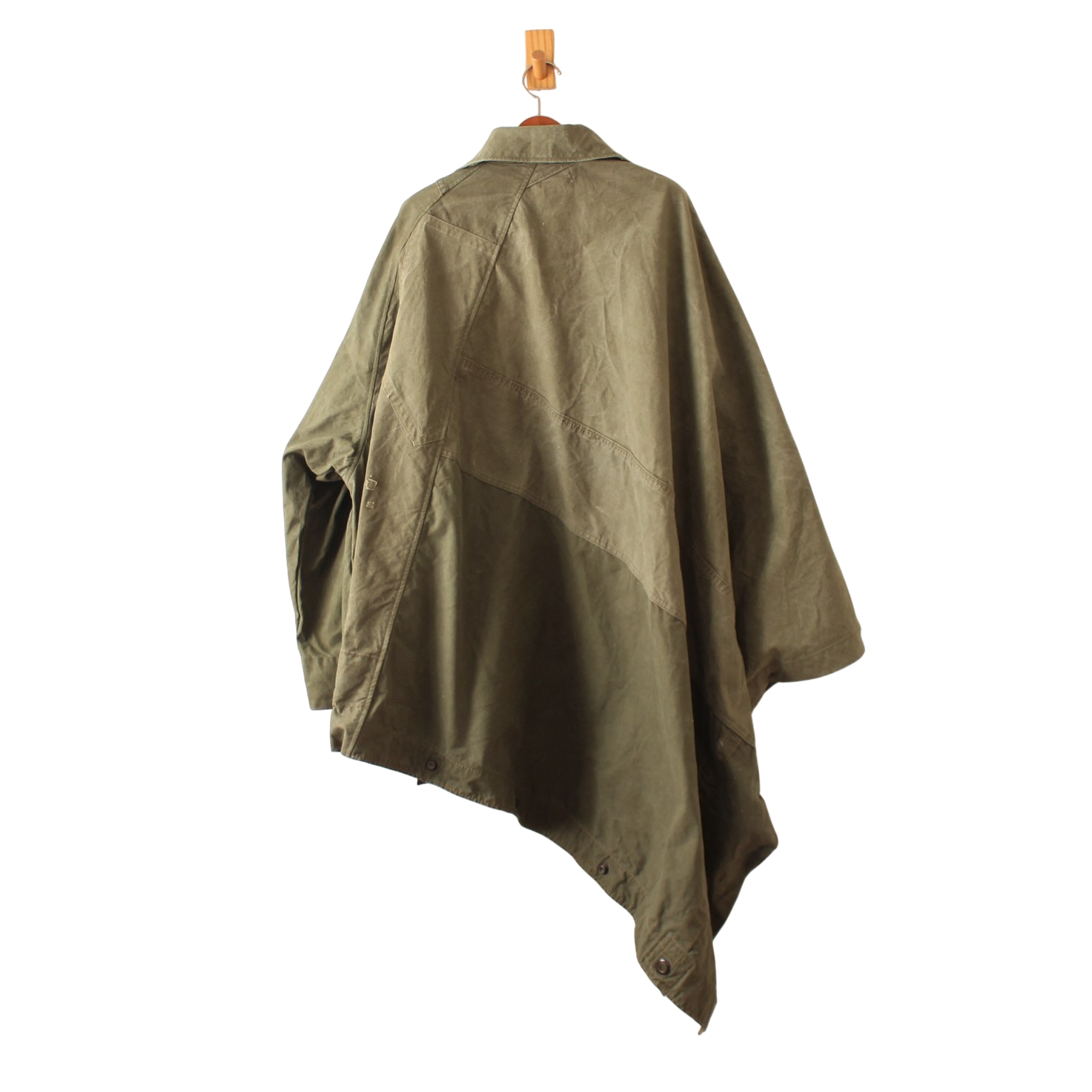 右半分がポンチョ、左半分は普通の袖付きジャケットという左右非対称のデザインになっています。