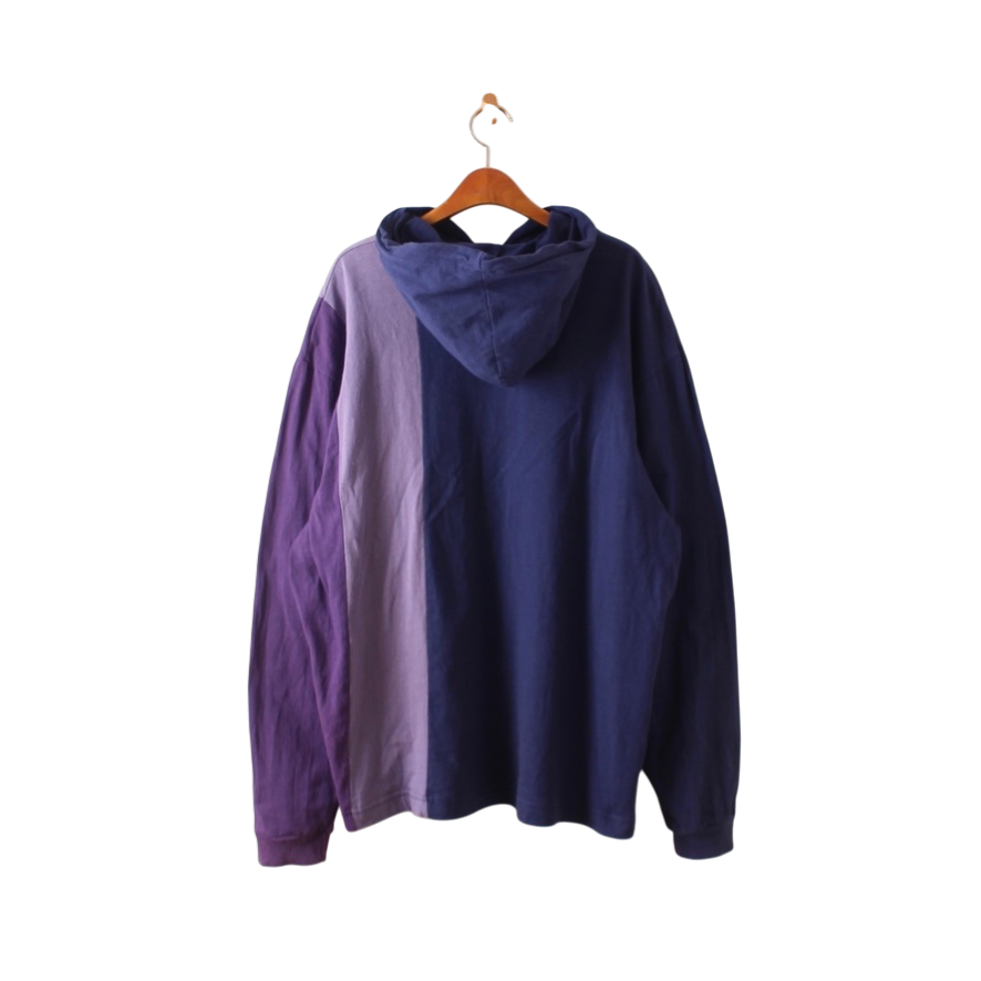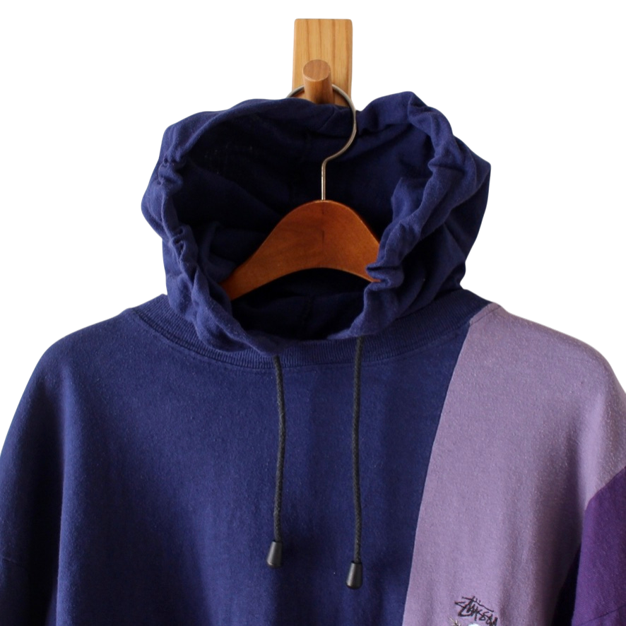 STUSSY ステューシー 80s オールド フード後付けデザイン パーカー スカル刺繍 カットソー生地 USA製 ネイビーにパープル系2色の切替 L (w-1620205)
