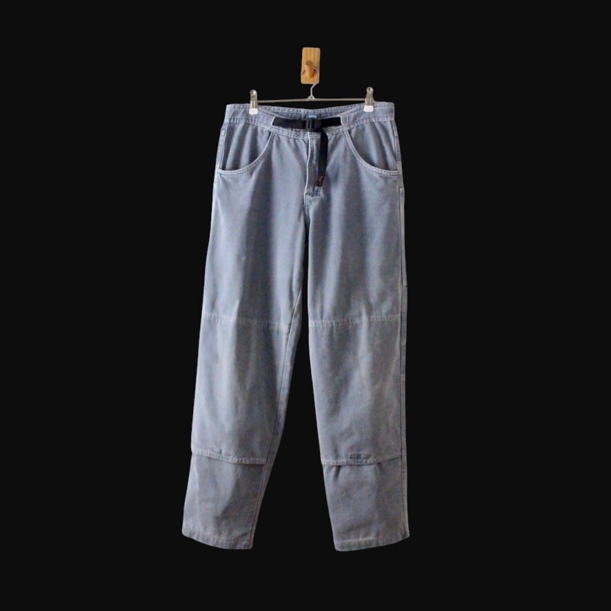 ジャンク! グラミチ 90s ダブルニー ダック生地 パンツ USA製 製品染めのブルーグレー系 S (w-2620406)
