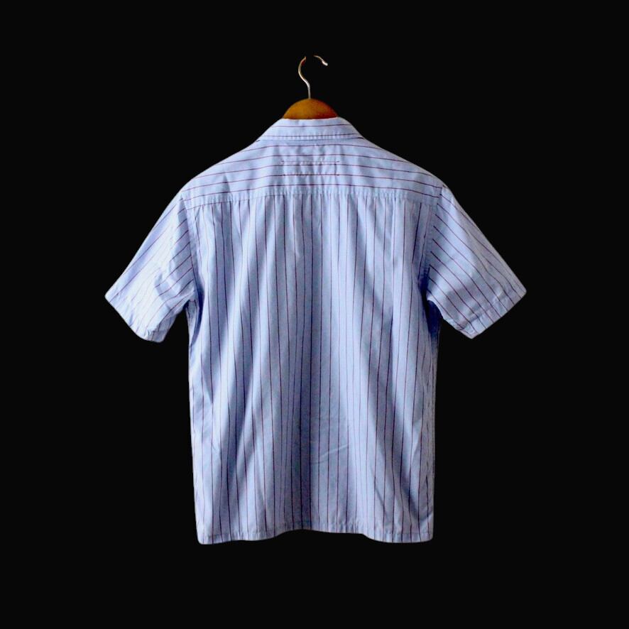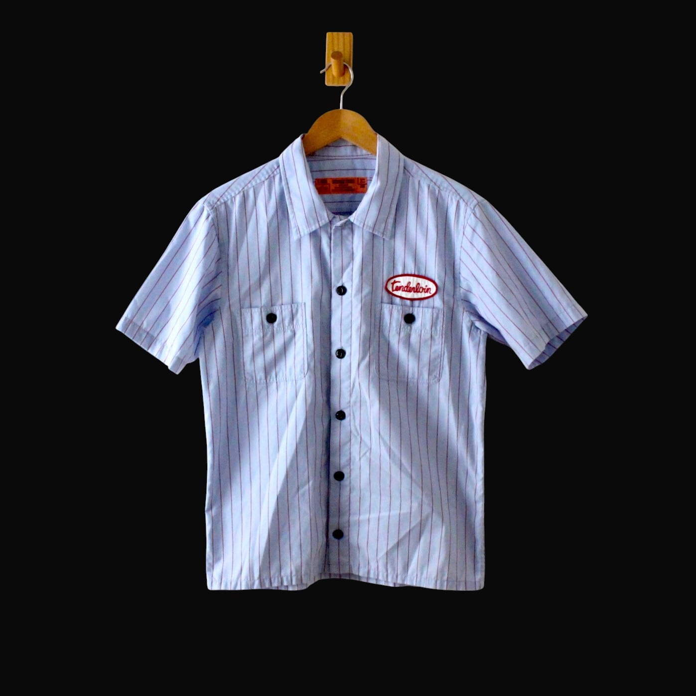 TENDERLOIN テンダーロイン 半袖 ワークシャツ ロゴワッペン付き 日本製 サックスブルー×赤のピンストライプ柄 XS (w-3620406)