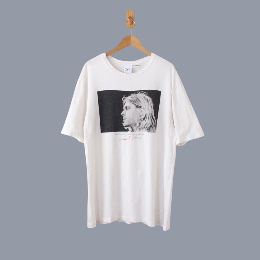 ZARA ザラ Tシャツ カートコバーン ユーズド加工 ポルトガル製 白 L 大きめ (w-3620416)
