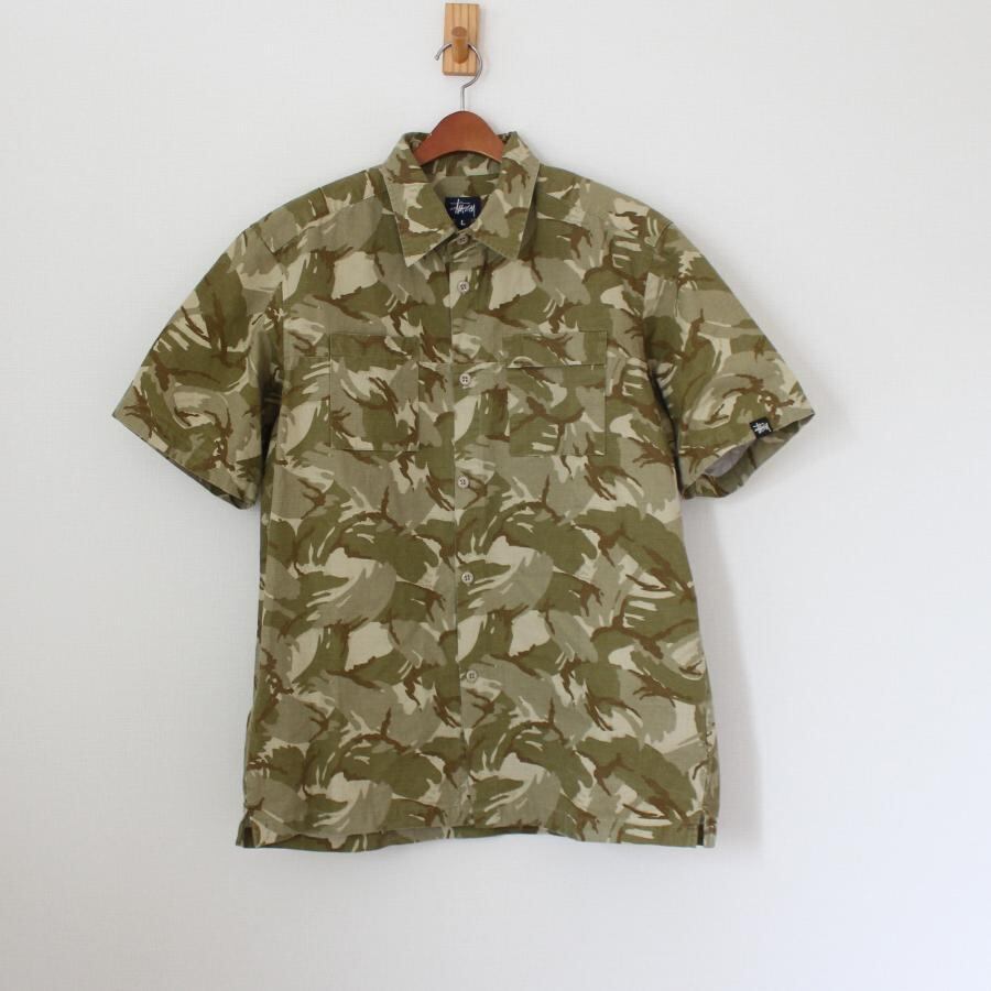STUSSY ステューシー 90s後期-00s前期 半袖シャツ 紺タグ USA製 最初期DPMデザートカモのような迷彩柄 L (w-2062)