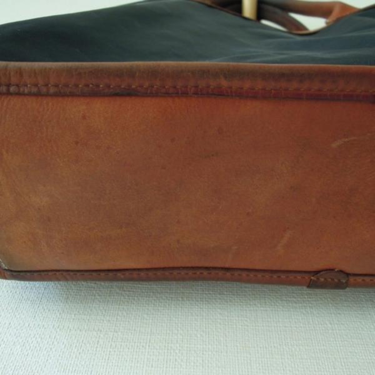 持ち手の黒ずみ、ナイロン部分の傷、メイン収納の裏地の色移り、シミと一箇所破れ、底の点々としたシミ、4角のうち2か所の傷など。