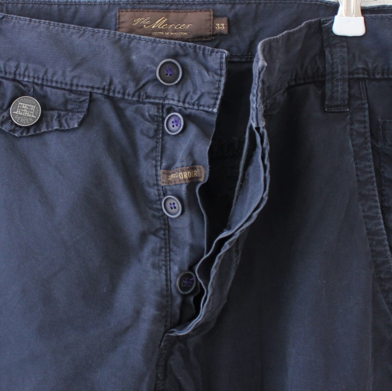 the Mercer マーサー カーゴパンツ 左右非対称マルチポケット ルーマニア製 製品染めのネイビー 33 (w-7420504)